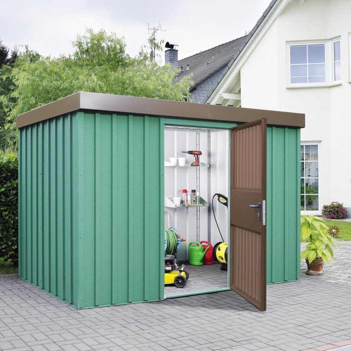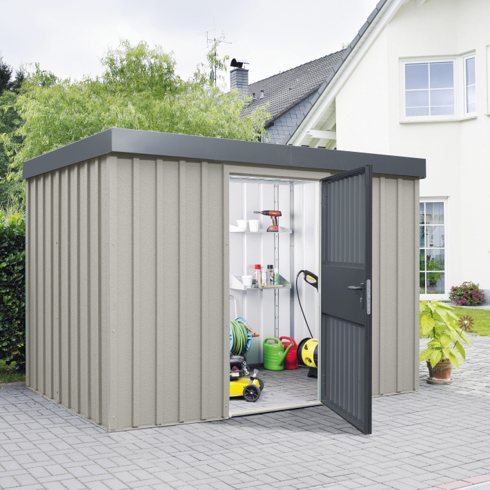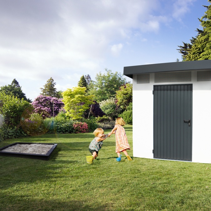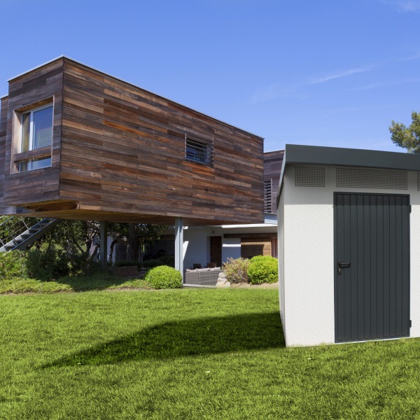 Das S1-Gerätehaus ist eine absolute Besonderheit in unserem System, denn die Wände wirken sehr edel durch eine wiederkehrende Fuge, alle 25 Zentimeter. Alle RAL-Farben sind bei diesem Gerätehaus anwendbar und Sie haben zusätzlich die Möglichkeit Wände, Tür oder Dachrandverkleidung in verschiedenen Farbtönen zu erhalten.
